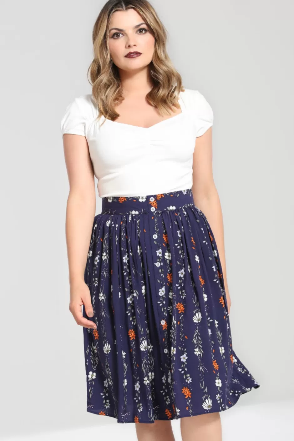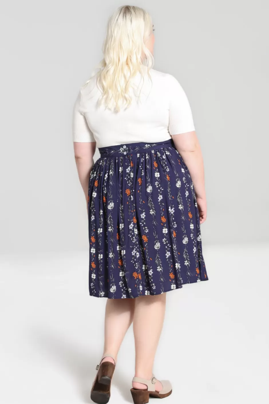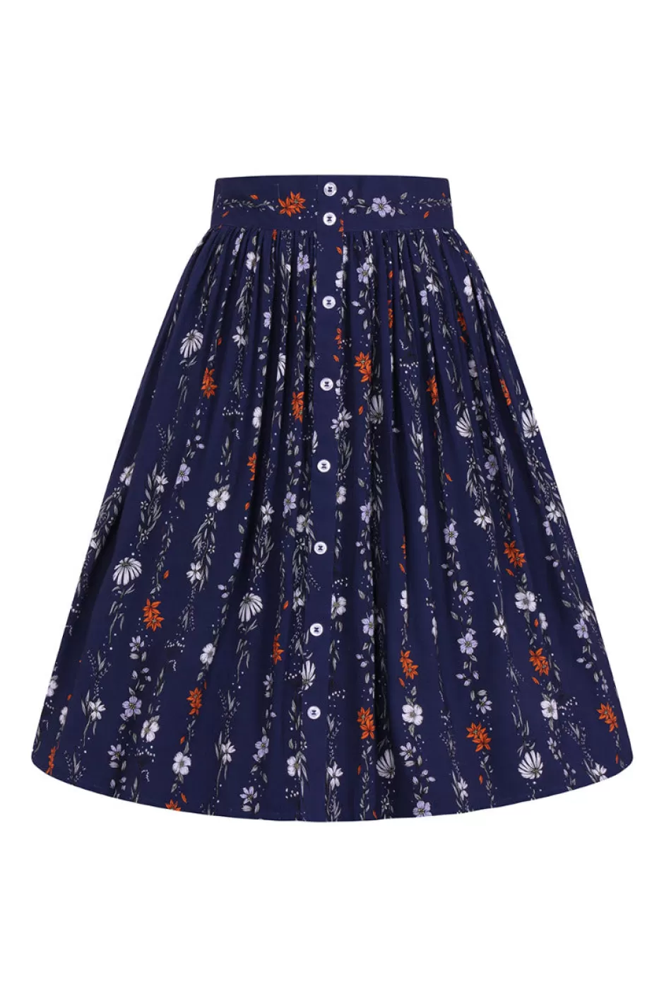 - Navy mid skirt printed with dainty white & orange autumnal flowers