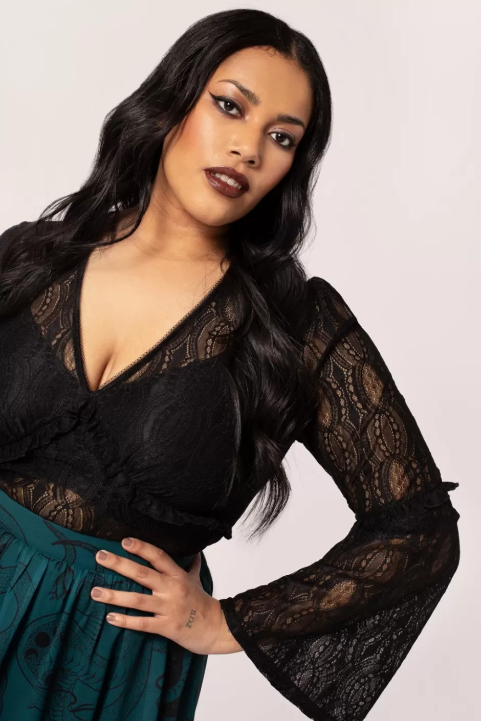 Available in Black and BurgundyStriped lace topV-neck chestline with small black lace trimUnderbust seam with frill trim…
