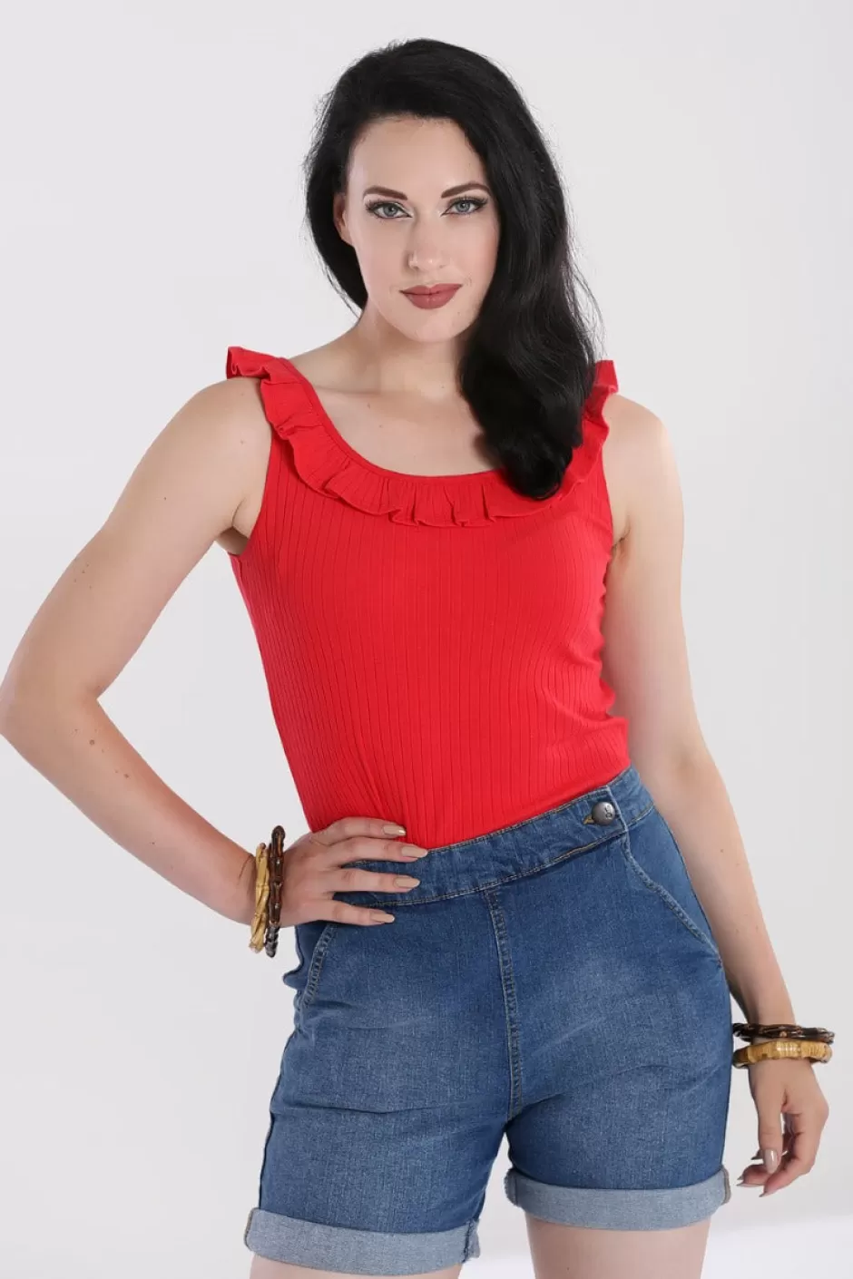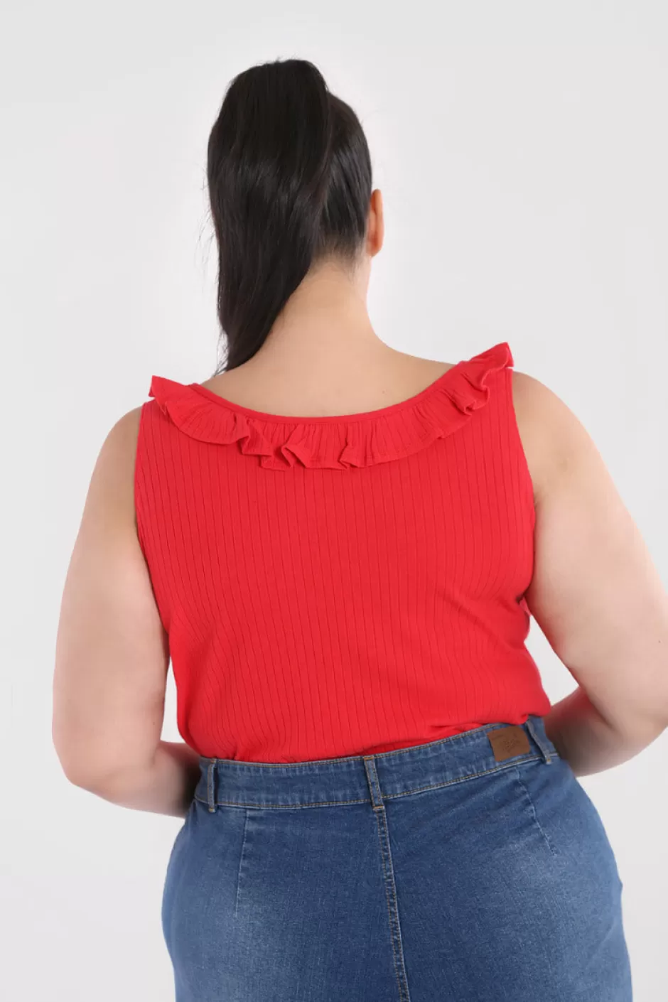 Stretch ribbed jersey plain topSleeveless vest top with ruffle edge around necklineScooped neckline front & backFitted s…