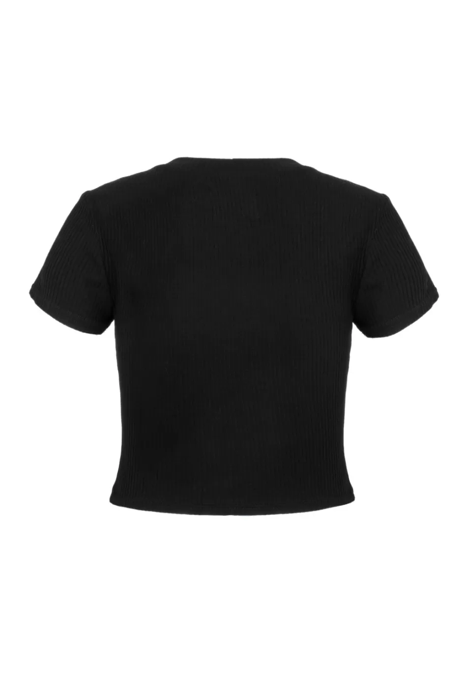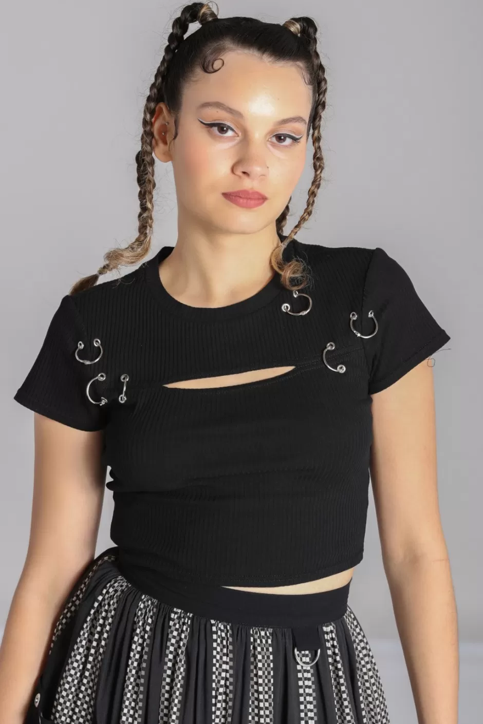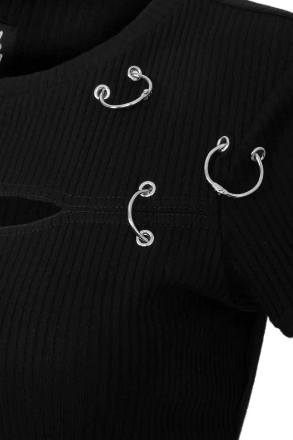 Black jersey crop topCut out keyhole on chestSilver eyelets and metal ring detailing Fitted style to just below waist in…
